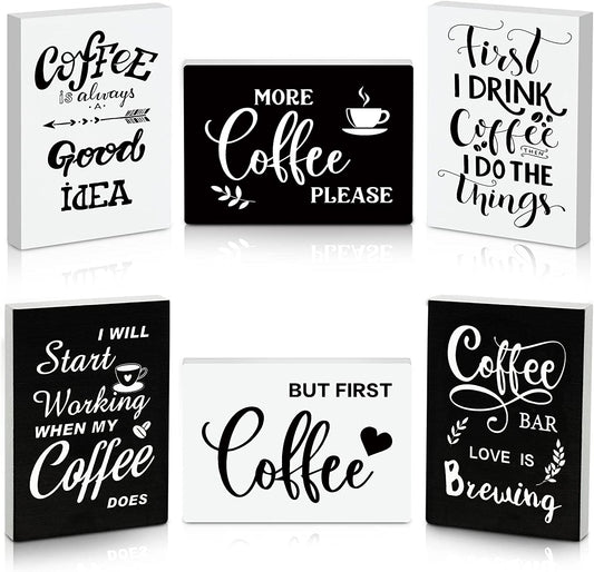 6 Pcs Wooden Mini Coffee Bar Sign Farmhouse Coffee Bar Decor Rustic But First Coffee Sign Love Is Brewing Coffee Table Sign Vintage Coffee Wood Plaque for Coffee Tiered Tray Decor Home Decorations