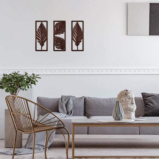 3 Pcs Boho Wooden Art Wall Decor Leaf Sign Wall Accent Rustic Palm Leaf Wood Art Wall Hanging Sculpture Vintage Tropical Plant Wood Wall Plaque for Home Bathroom Living Room Office Decoration (Brown)