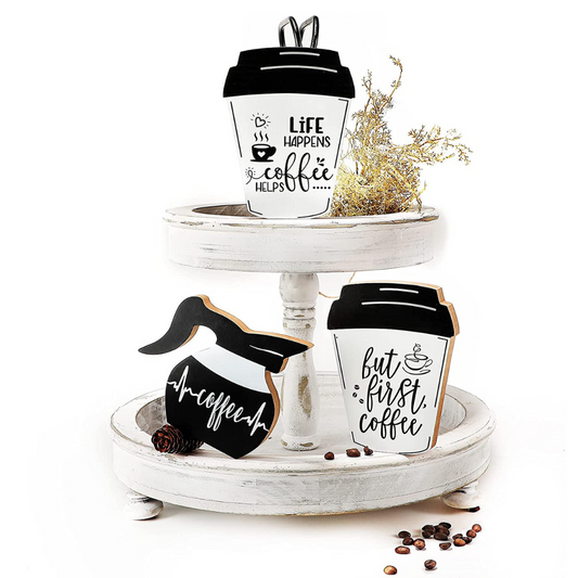 3 Pieces Coffee Bar Decor Signs But First Coffee Wood Plaque Rustic Coffee Bar Tiered Tray Wood Signs Farmhouse Vintage Table Centerpiece Mug Life Coffee Wood Sign for Home Coffee Bar (Cute Style)