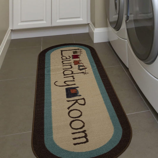 Machine Washable Bordered Laundry Room Rug Non-Slip Rubberback 2x5 Laundry Runner Rug for Laundry Room, Bathroom, Washroom, 20" x 59" Oval, Beige