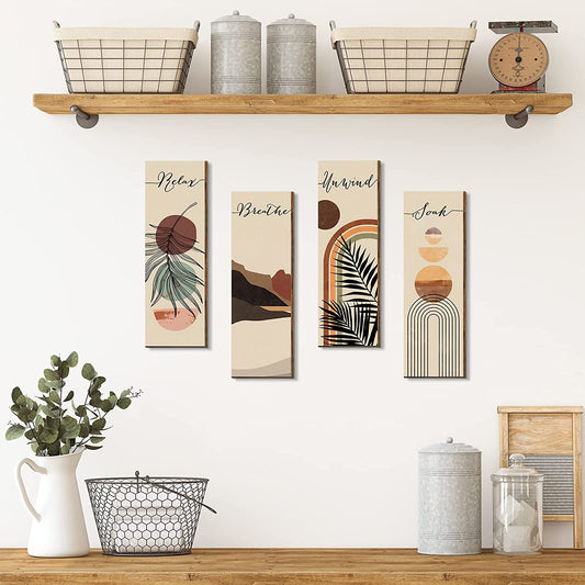 Unwind Breathe Sign Decors Bathroom Wall Arts Abstract Boho Wooden Wall Painting Mid Century Minimalist Botanical Rustic Plaque (11 x 3.5 Inch)