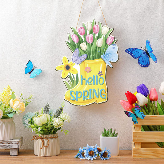 Hello Spring Door Sign Colorful Tulip Flowers Spring Decor Sign Hanging Door Signs Rustic Wall Decor Farmhouse Wood Hanging Plaque for Home Farmhouse Home (Boots)