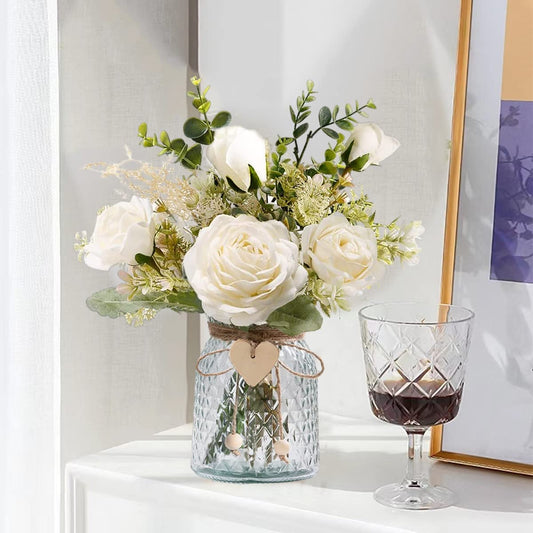 Fake Flowers with Vase, Artificial Flowers in Vase, Table Centerpieces for Dining Room, Silk Flower Arrangements Set, Living Room Bathroom Plants Decor, Dining Table Centerpieces (White)