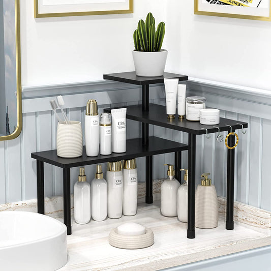 Bathroom Organizer Countertop Bathroom Shelf, 3 Tier Corner Shelf Moveable Bamboo Organizer for Make Up, Dresser Table, Bathroom countertop, Desktop Shelf (Black)