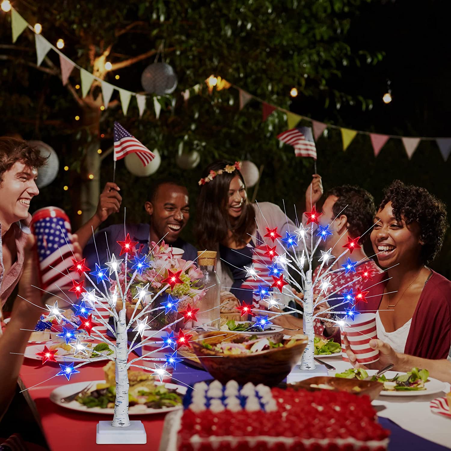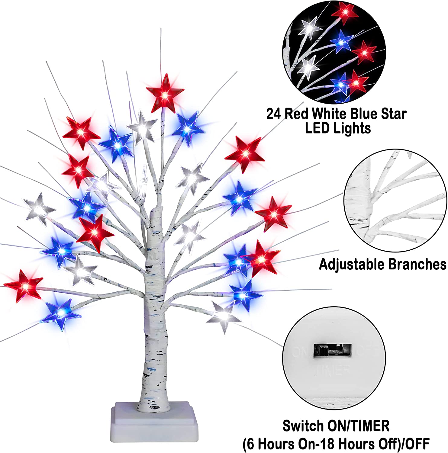 - ★【2 Pack Red White and Blue Tree Lights】Designed with 24 LED red white and blue star lights, these 4th of july decor tree light look beautiful and are perfect for creating a wonderful patriotic atmosphere for your Memorial Day, Independence Day, American Flag Day, Labor Day, etc.