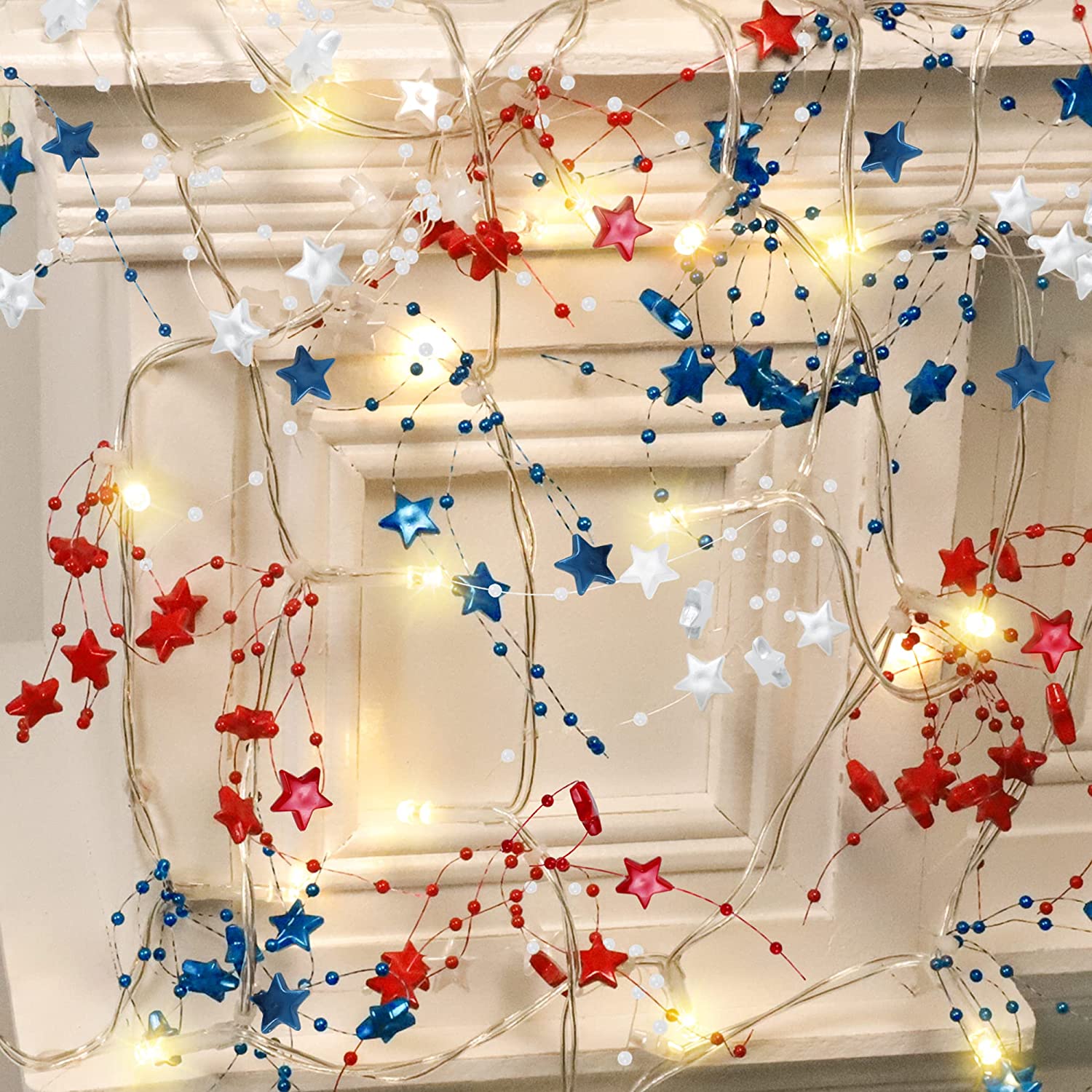 - ★【Perfect Addition for Patriotic Decor】This 4th of july garland with lights is the perfect patriotic decor for your mantel, tree, stairs, fireplace, wreath, table, party, bedroom or anywhere you want to decorate. The wires of this red white blue lights is transparent so they are very easy to hide