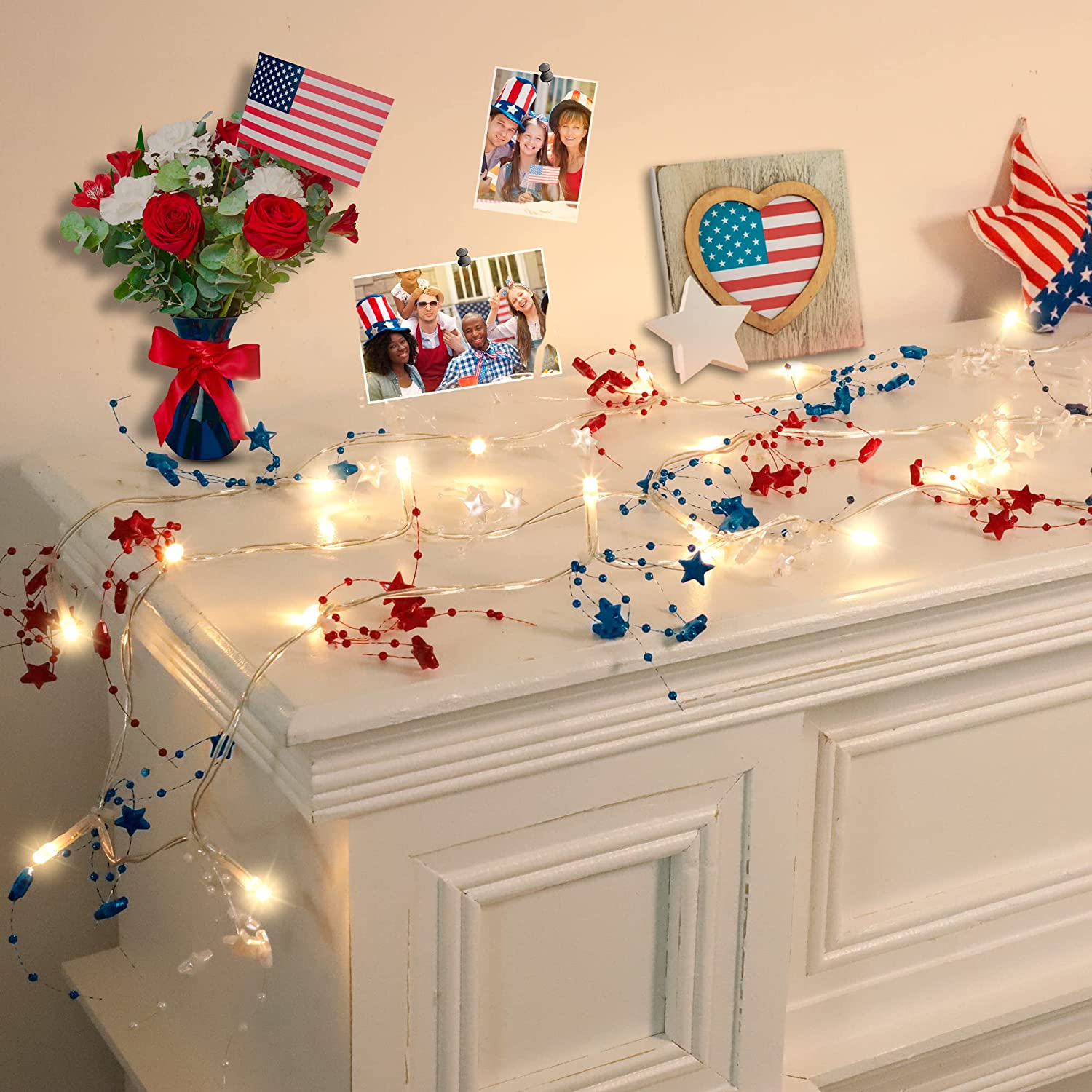 - Package includes: 4th of july Garland with Lights x 1; Make your home and party more attractive and festive with these beautiful red white and blue garland decorations