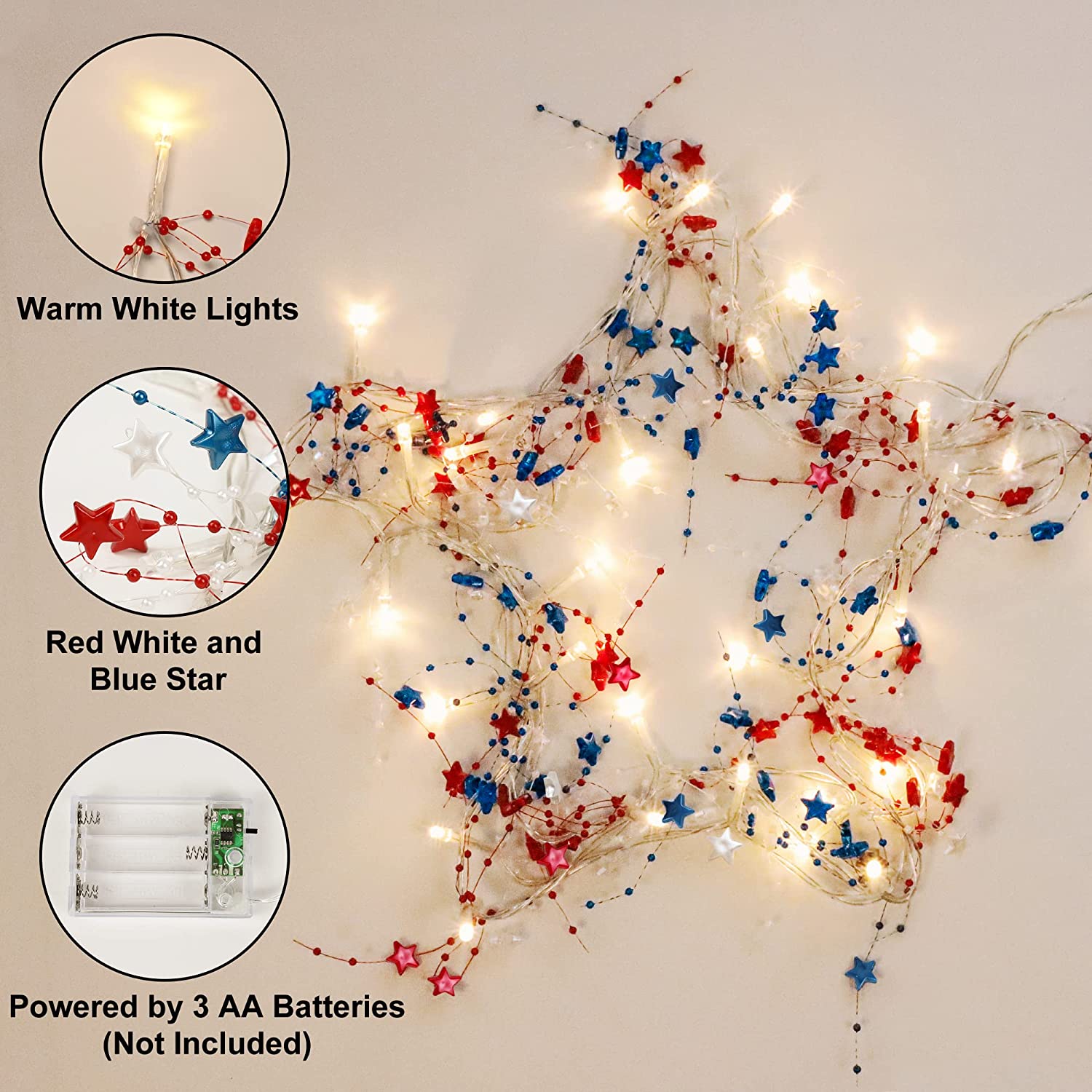 - ★【Battery Operated 4th of july Garland Lights】This cute fourth of july decor star string lights powered by 3 AA batteries (not included). Since this 4th of july lights battery operated does not require a plug, it can be decorated anywhere you want