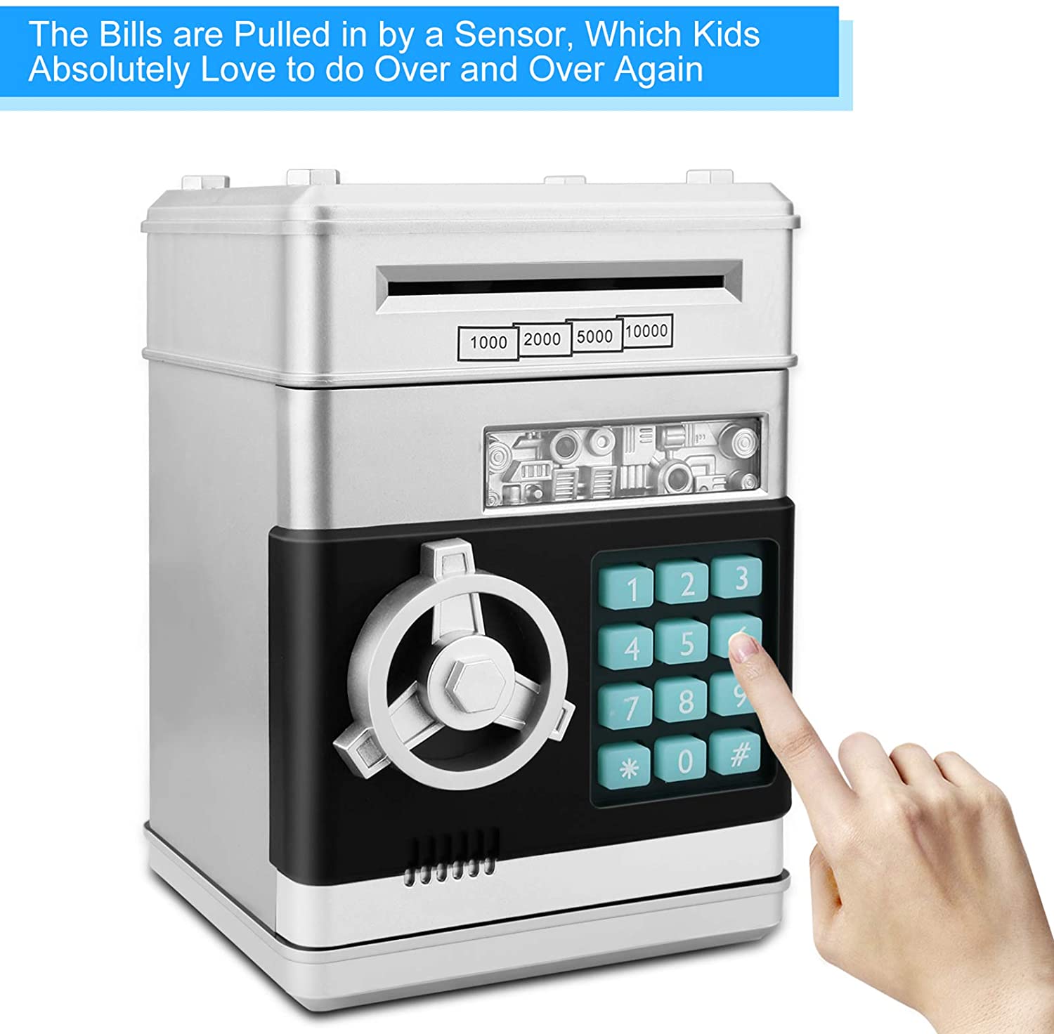 Electronic ATM Password Piggy Bank Cash Coin Can Auto Scroll Paper Money Saving Box Gift for Kids (Silvery)