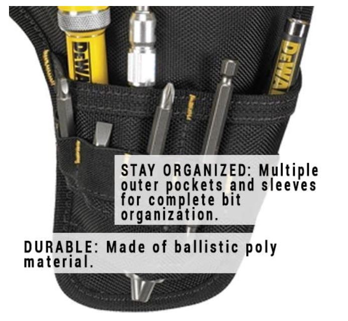 🚚 Fast Shipping The DEWALT heavy-duty drill holster is angled for better balance, has a safety strap with a quick release buckle, and features multiple pockets and sleeves to organize your bits and accessories. Feed the belt through loop EASY ACCESS TO DRILL: This drill holster has a safety strap with quick-release buckle for easy access to your tools. DURABLE DRILL HOLSTER: This DEWALT drill holster is made of ballistic poly material for added durability. STAY ORGANIZED: This drill holster contains multiple outer pockets and sleeves for complete bit organization. CONVENIENT: Hook-and-loop backing help to keep strap back when drill holster is not in use. ANGLED FOR BETTER BALANCE: This drill holster holds most brands of T-handle drills. Added Pockets and Elastic Loops Hold bits, chuck key, drivers, etc. Adjustable strap and quick-release buckle holds drill securely in place Ballistic poly material provides strength and durability Disclaimer: Not ideal for lefties as it's not reversible 7.2 x 2.2 x 13.8 inches