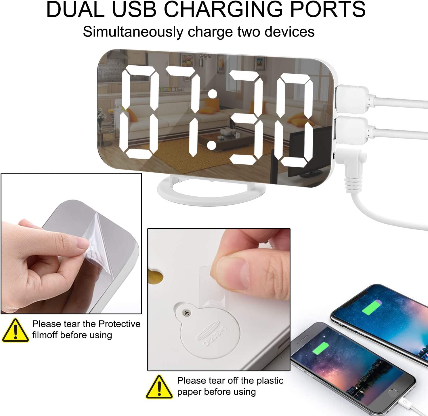 Digital Clock Large Display, LED Electric Alarm Clocks Mirror Surface for Makeup with Diming Mode, 3 Levels Brightness, Dual USB Ports Modern Decoration for Home Bedroom Decor-White