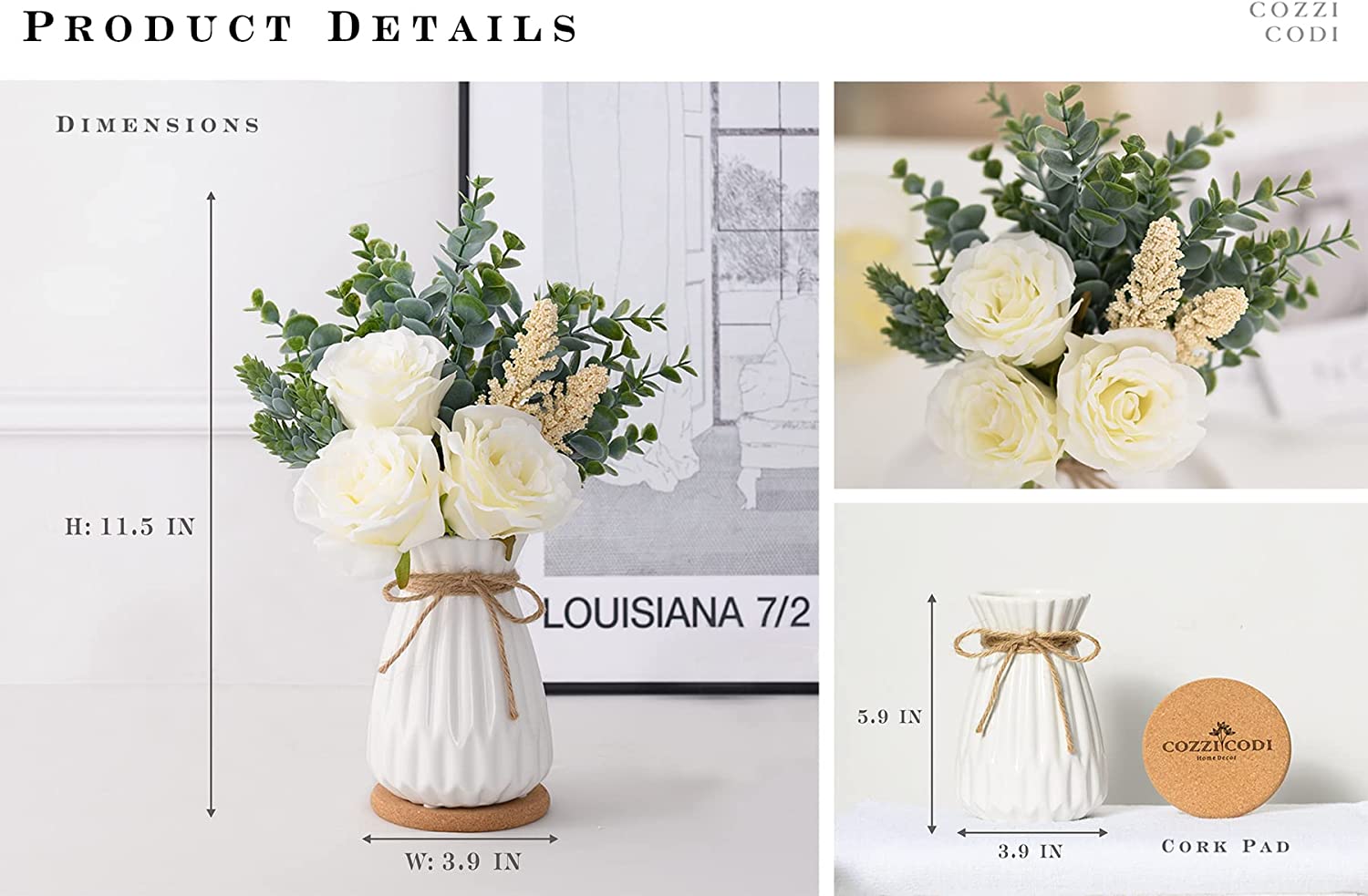 - ♥ Aesthetic Room Decor: The artificial flowers with vase for decoration include a flower bouquet, one ceramic vase and a decorative cork pad. The silk flower arrangement is composed of white roses flowers and eucalyptus. The flower arrangements artificial centerpiece is great for living room decorations, shelf decor, coffee table decor, kitchen table decor and dining table centerpiece.