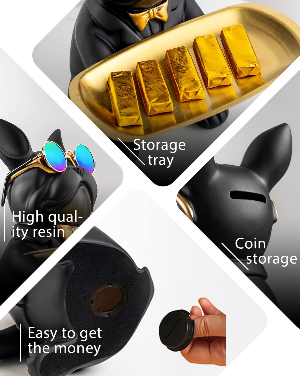 - **High Quality And Fashion** The French bulldog statues for home decor are carefully made of high-quality resin, which makes them stable, wearable, and easy to clean. Matte black home decor has more texture, it will be the best of many home decorative items. With a metal tray, well-made, and stylish, will not easily break and not easy to rust.