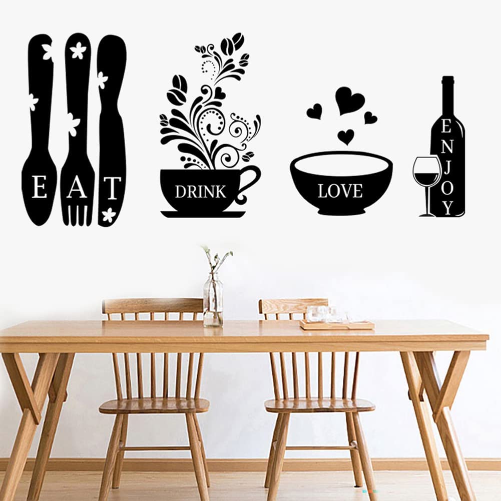 - Kitchen wall stickers includes:you will receive 1 the Wall decal are in compact form It including a positive phrase, and Knife fork spoon bowl wine glass wine bottle coffee cup, write separately with the words of eat, drink, love and enjoy. specifically, as shown in the figure! they will bring you nice appetite and become a delicate decoration of kitchen and dining room, fully demonstrates the importance of the kitchen and dining room.