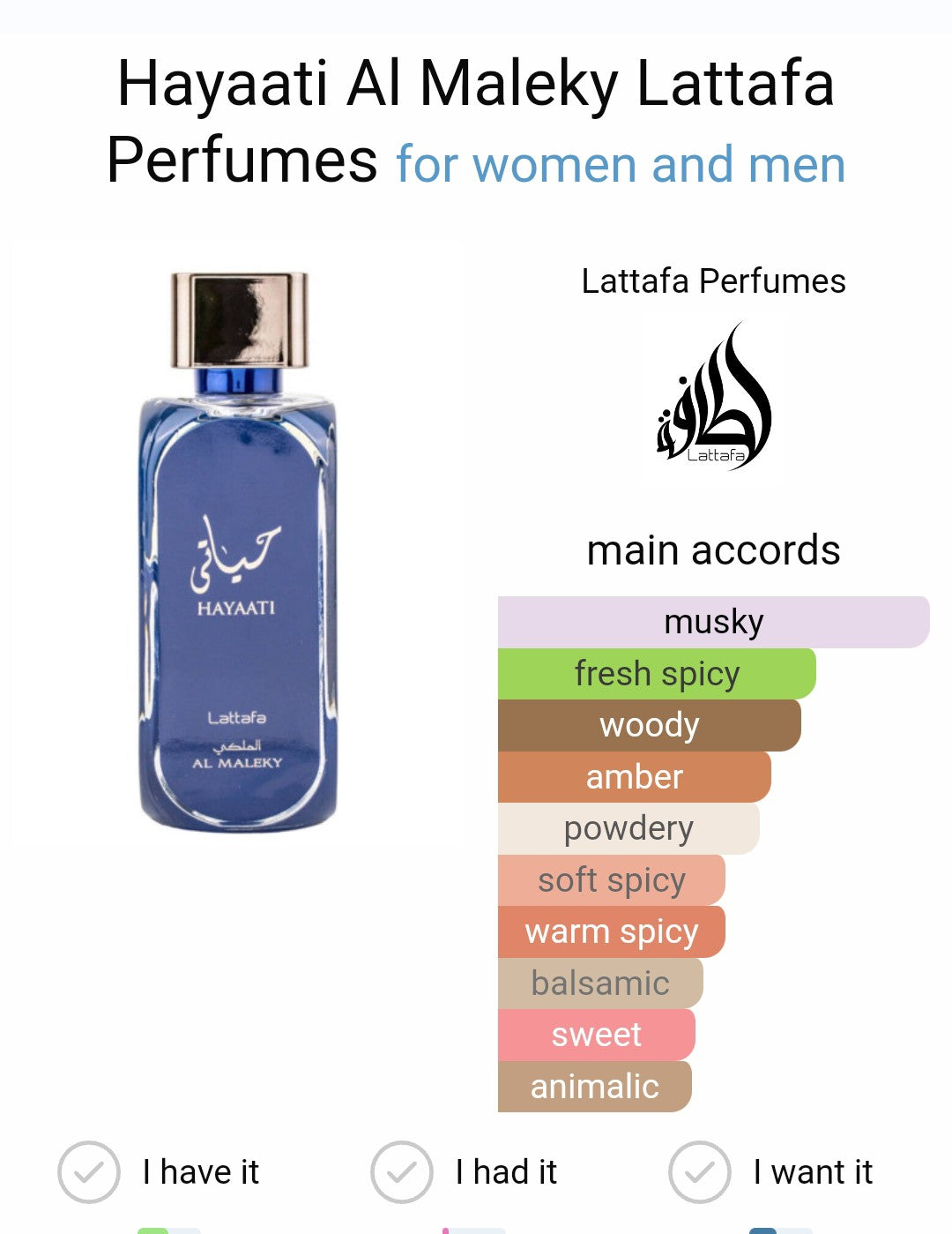 - Hayaati Al Maleky by Lattafa Perfumes is a Amber Spicy fragrance for women