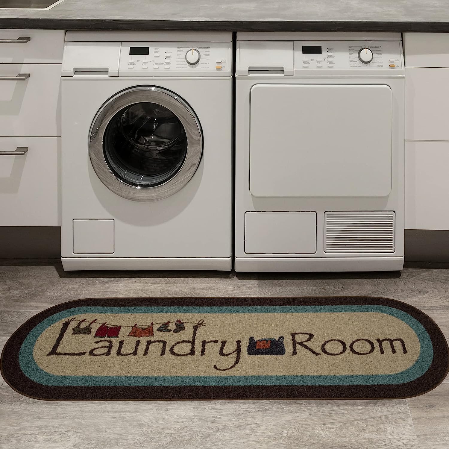 Machine Washable Bordered Laundry Room Rug Non-Slip Rubberback 2x5 Laundry Runner Rug for Laundry Room, Bathroom, Washroom, 20" x 59" Oval, Beige