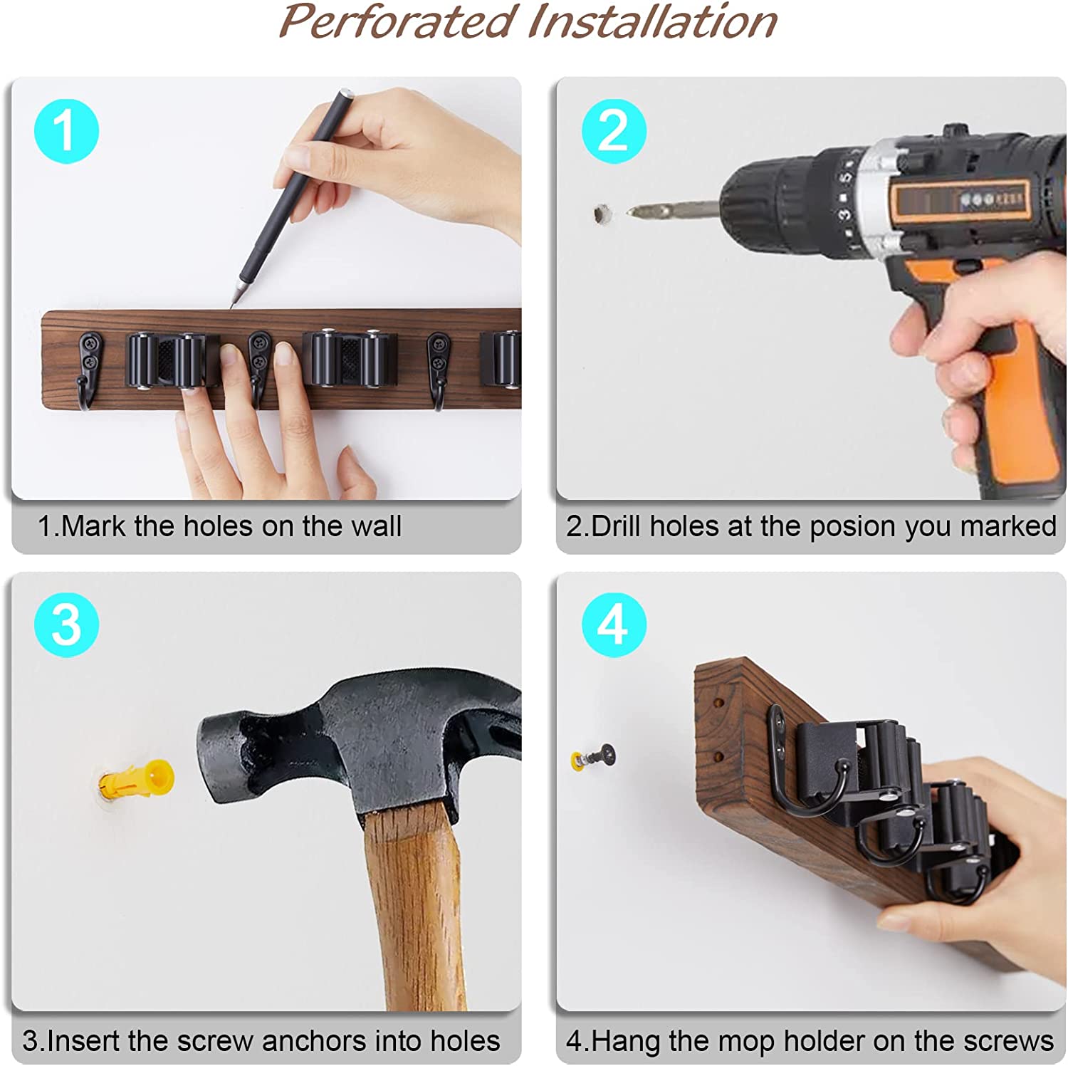- EASY INSTALLATION - You can easily mount this broom holder to most flat wall surfaces using the included mounting hardware (including drywall anchors and standard screws). Note: Please note that the distance between the mounting holes is 35.5cm/14 inch.