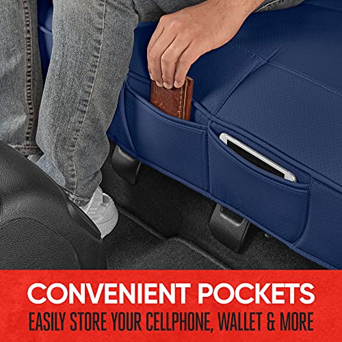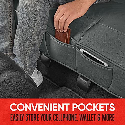 - CONVENIENT FRONT POCKETS – Easily store your cellphone, wallet and more using the built-in front pocket. The stitched divider helps to keep your goods organized. Conveniently add some extra storage and protection to your car using these seat covers.