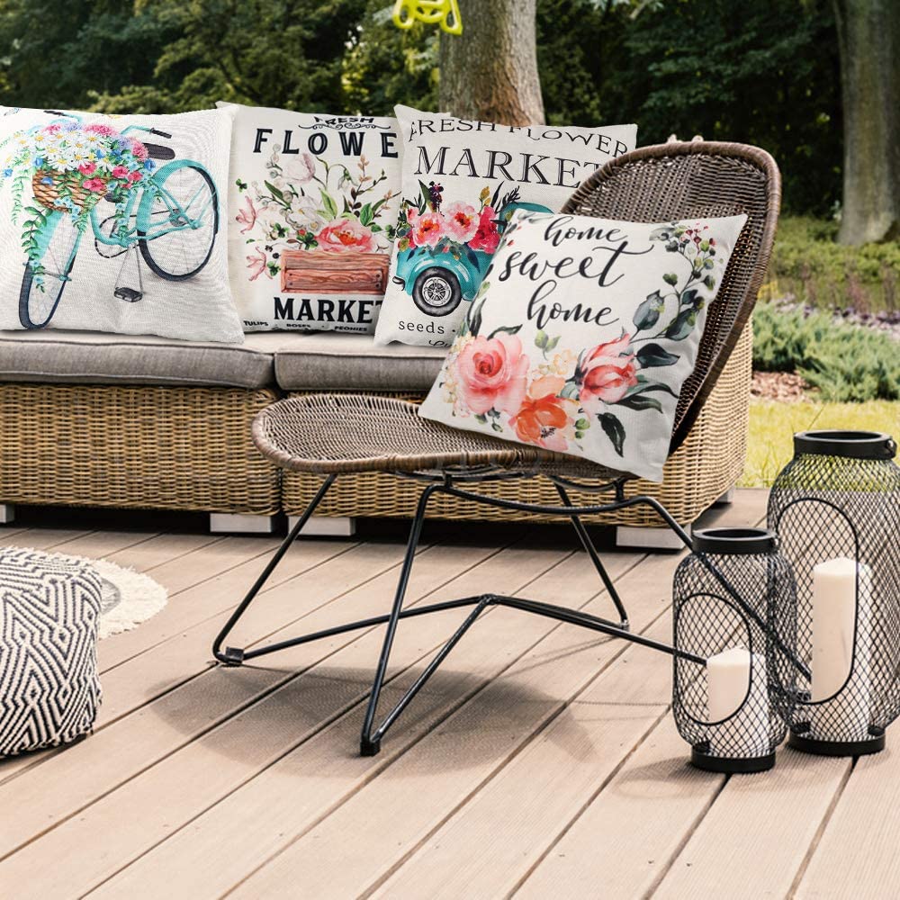 Spring Pillow Covers 18x18 Inch Set of 4 Fresh Flower Market Spring Decorations Throw Farmhouse Pillowcase Linen Cushion Case for Spring Home Décor