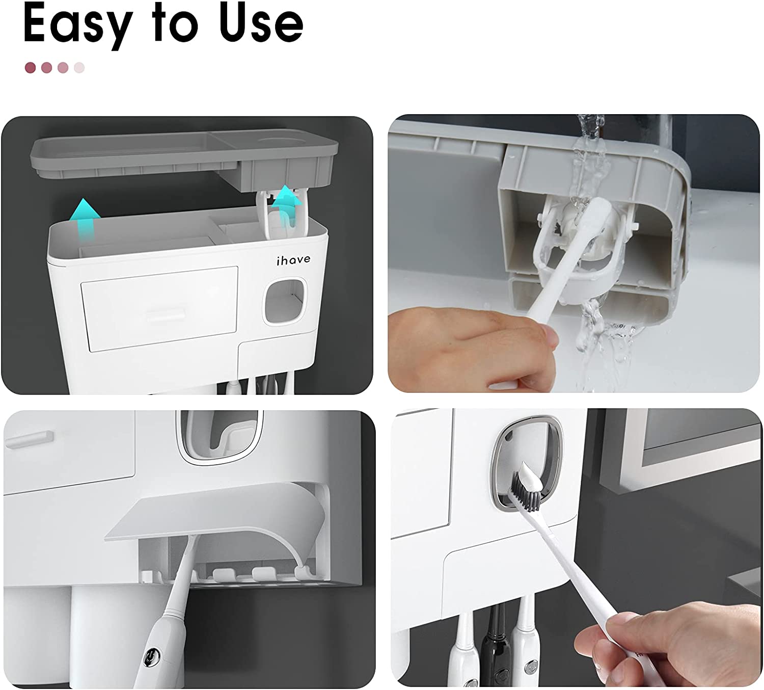 - Multifunction: This multi-function toothbrush holder comes with a automatic toothpaste dispenser, making it easy to squeeze the toothpaste without waste. The 3 magnetic mouthwash cups are designed with an upside-down drain, dust-proof and waterproof. You can hang 6 toothbrushes simultaneously, which is suitable for the whole family.