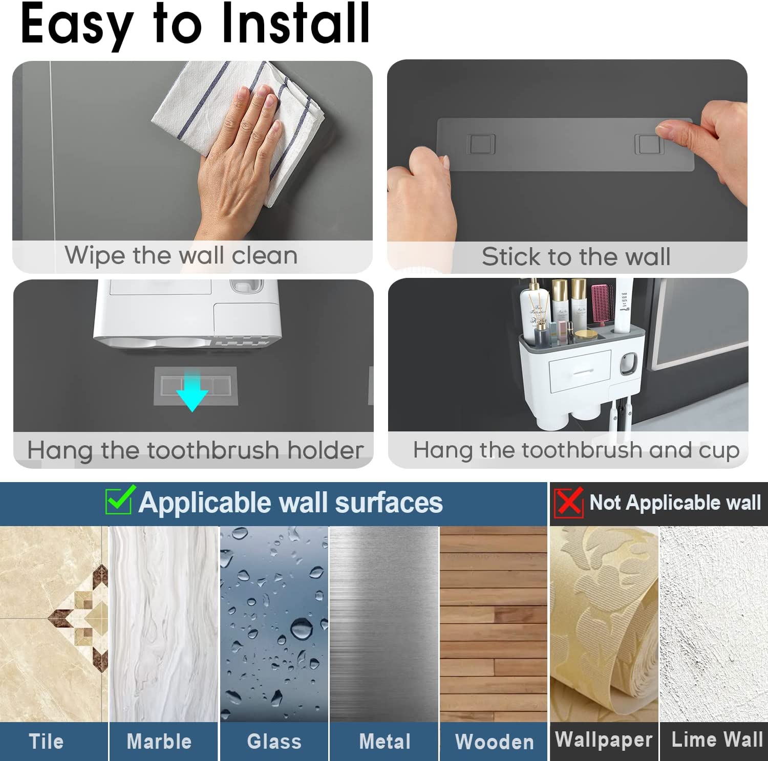 - Easy to Install: No holes and no drill. Wall mounted installation does not hurt the wall. Just clean the wall and press the adhesive strip to bond the wall for 2 hours entirely, then you can hang the tooth brush holder.