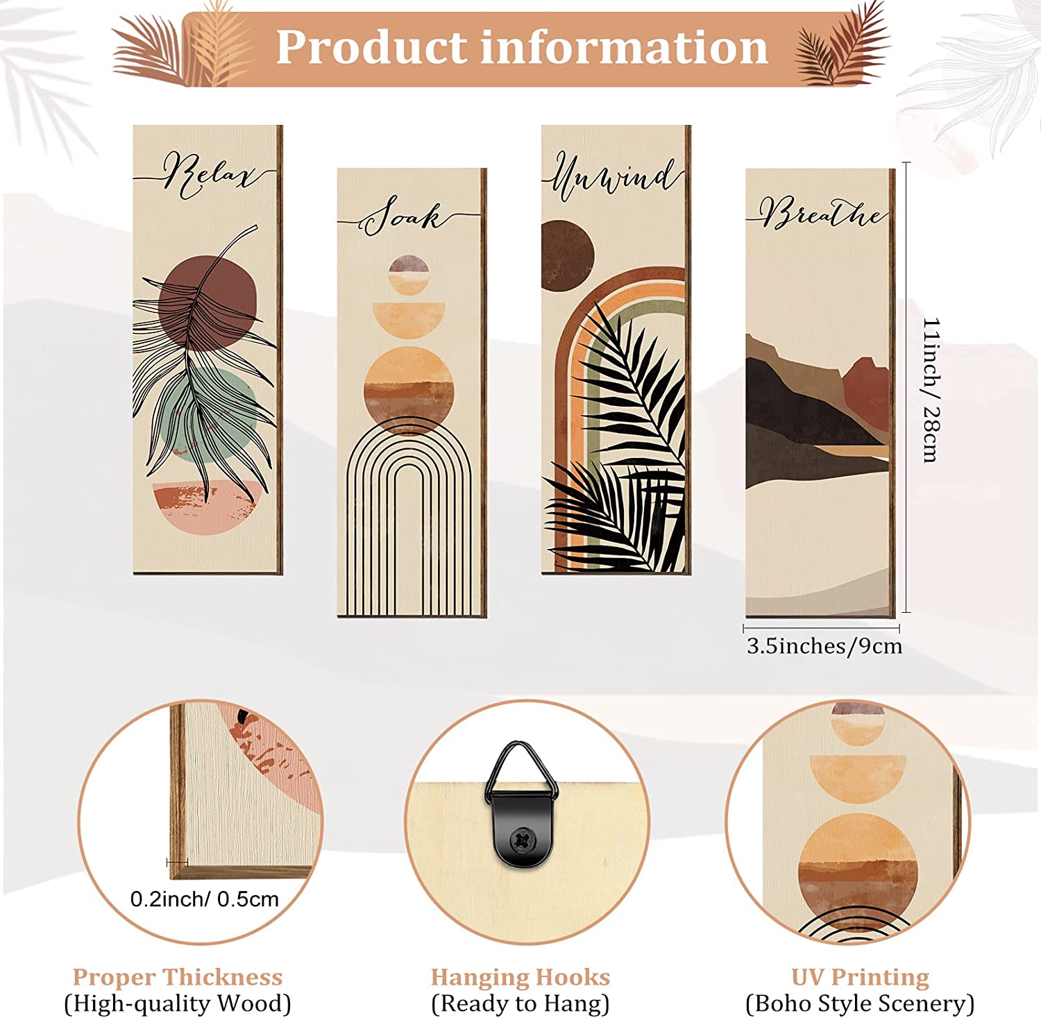 - Package Includes: you will receive 4 pieces of Boho bathroom wooden wall art decoration, each wooden sign has a triangular hook on the back for your hanging; These Bohemian style art prints not only enrich the space, but are also full of exhilarating, warm and relaxing feelings