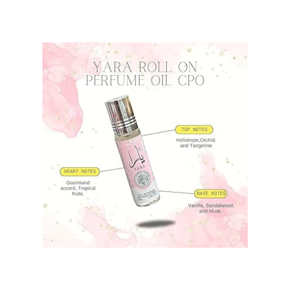 Yara Perfume Oil's base notes show a warm and seductive blend of creamy vanilla and smooth caramel, which adds a hint of indulgence and sophistication. These opulent and soothing accords leave a mesmerizing trail that lingers throughout the day, leaving an indelible impact wherever you go.